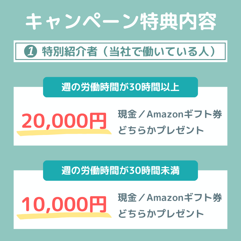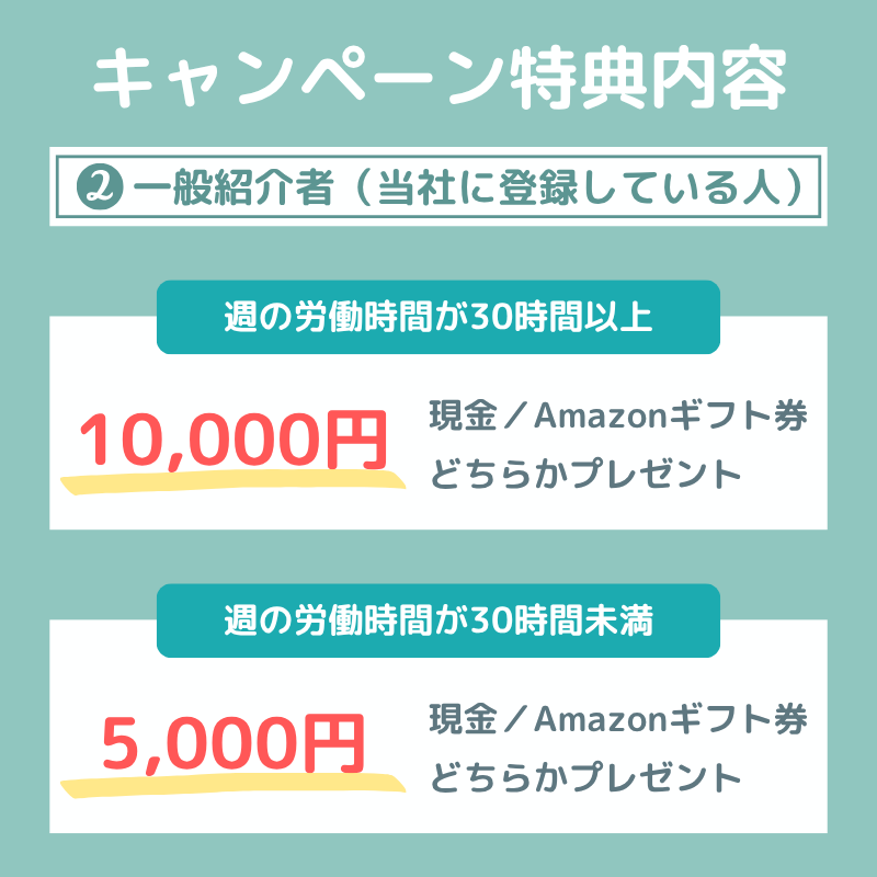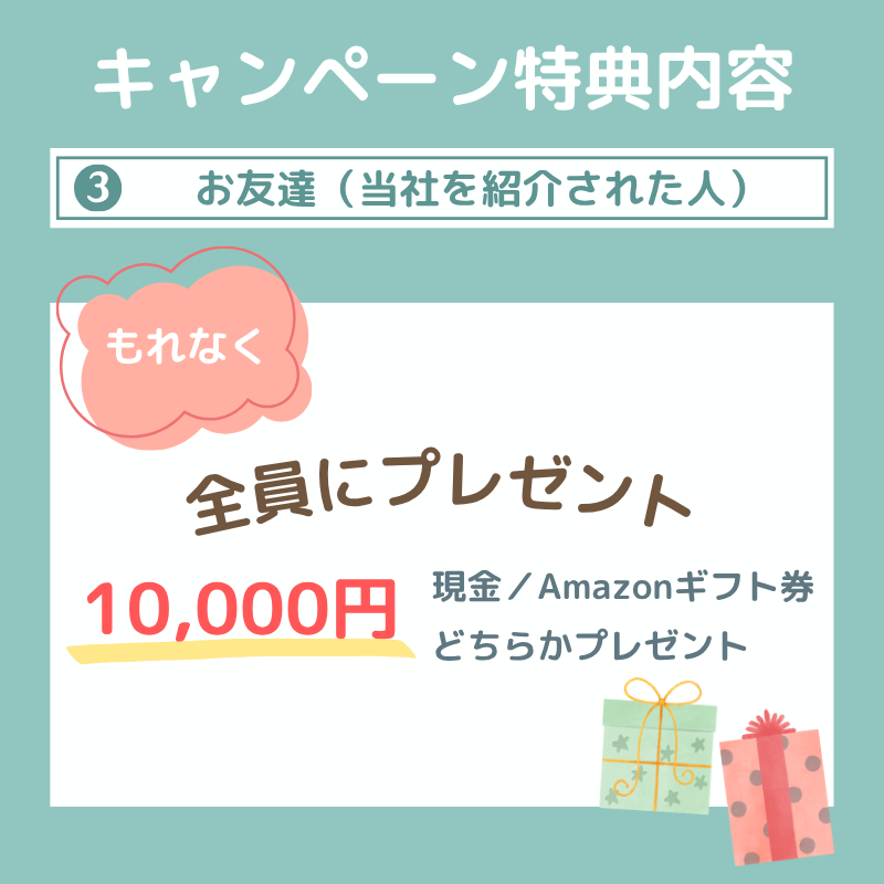 だからこそ、あなたからの紹介で初めて当社に登録し、20日以上お仕事を続けてくれたお友だちには、🎁 もれなく10,000円をプレゼント!