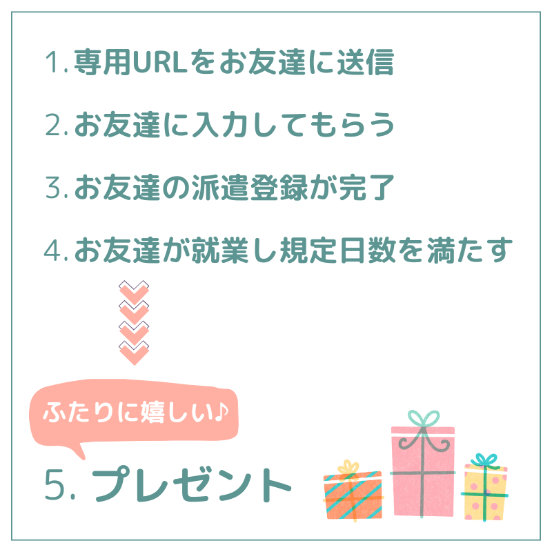 あなたのご紹介で登録されたお友だちが働き始めると、あなたにも、お友だちにも嬉しい特典をプレゼント🎁