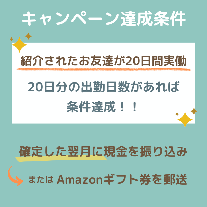お友だちが職場で20日間お仕事を続けた時点で、プレゼント対象となります。